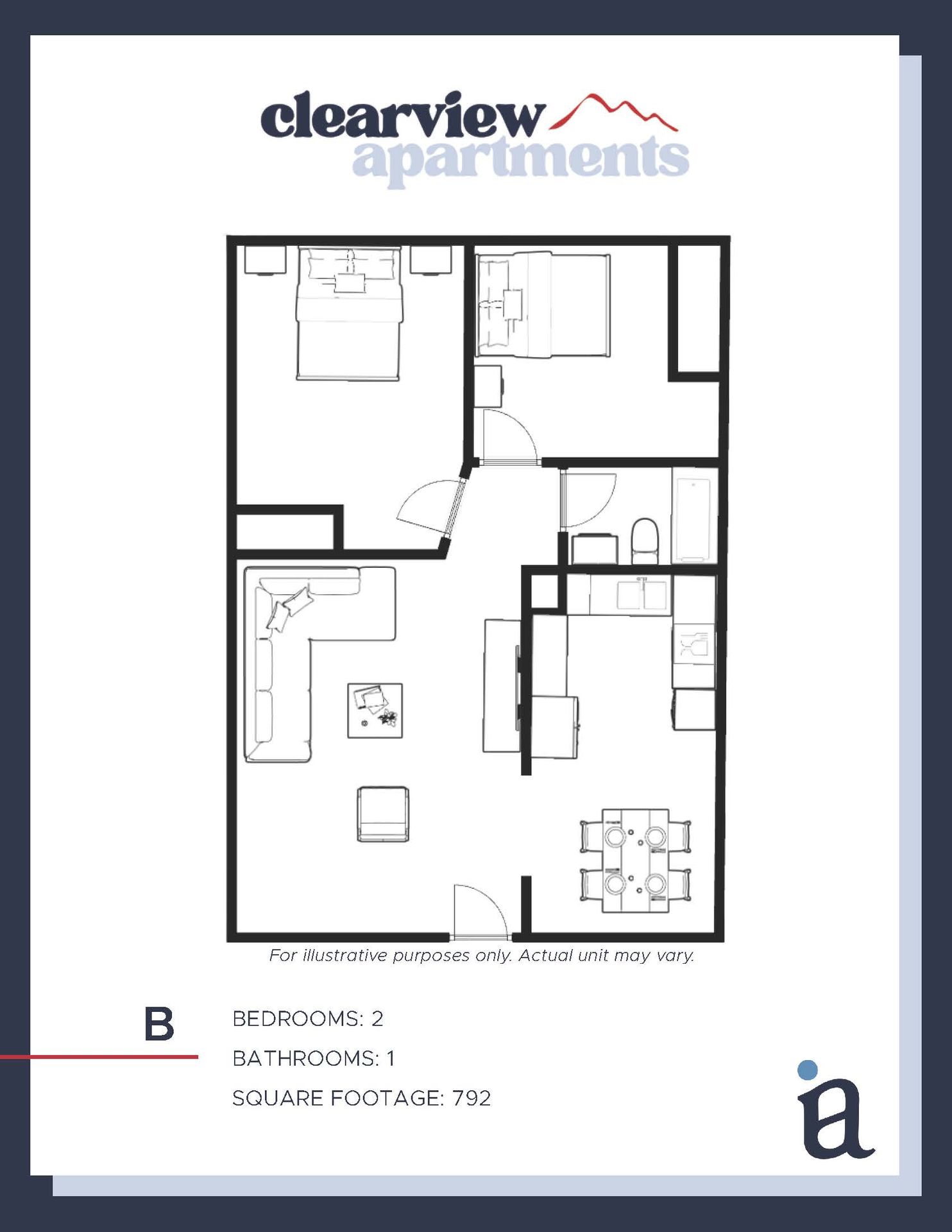 - Spacious 792 sq. ft. layout with comfortable living and dining areas