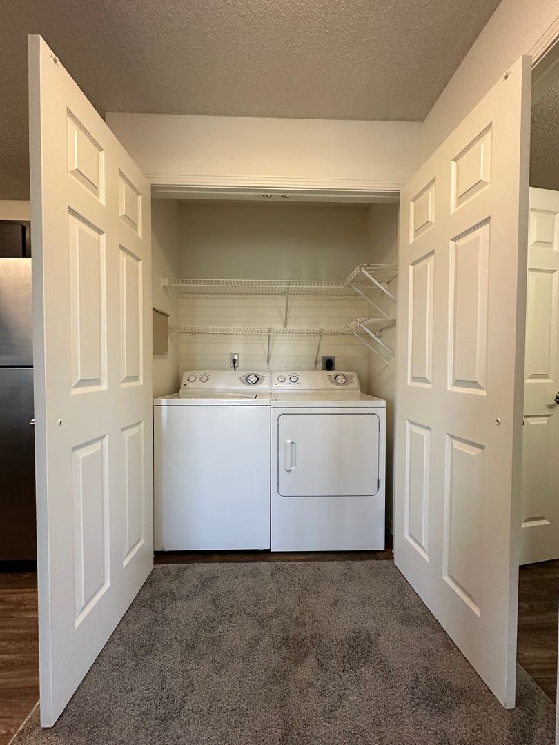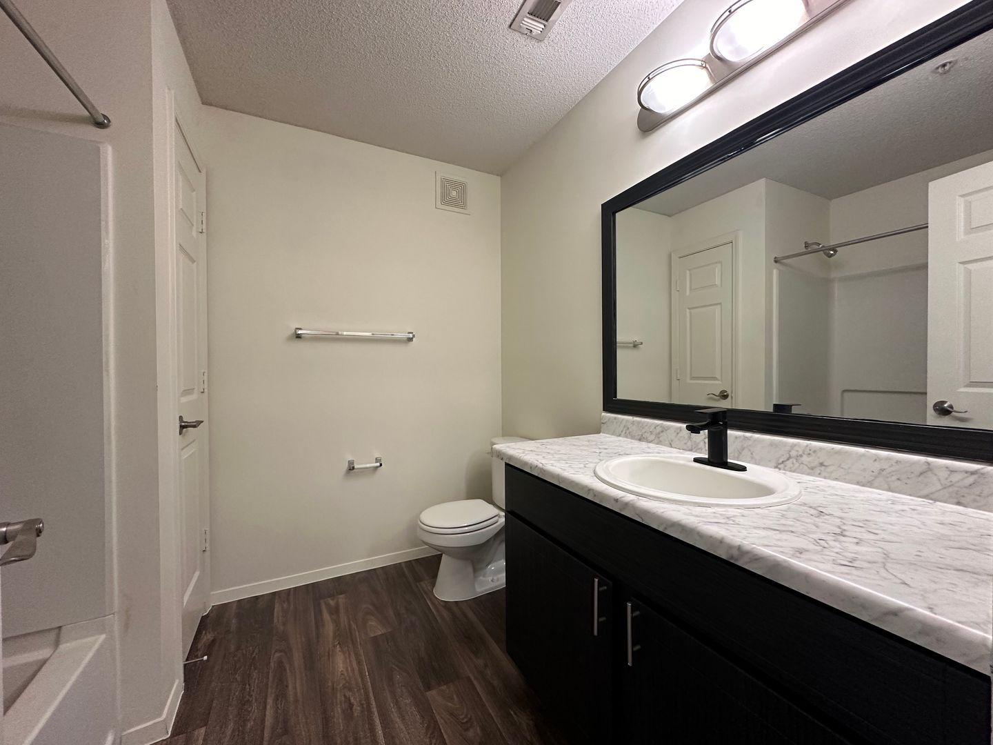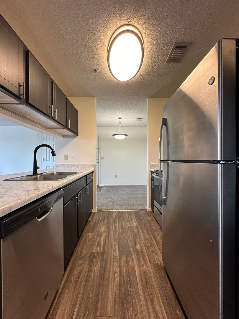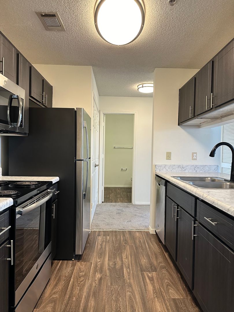 Modern and sleek. Our Lincoln floorplan is a 1br, 1b apartment with gray cabinets, black hardware, stainless steel kitchen appliances, fauxwood & carpet flooring. Washer and dryer, most of all the ideal space to balance life, work, and play. Come be a part of The Hamilton at Turman Farms where Excellence and Convenience Meet!